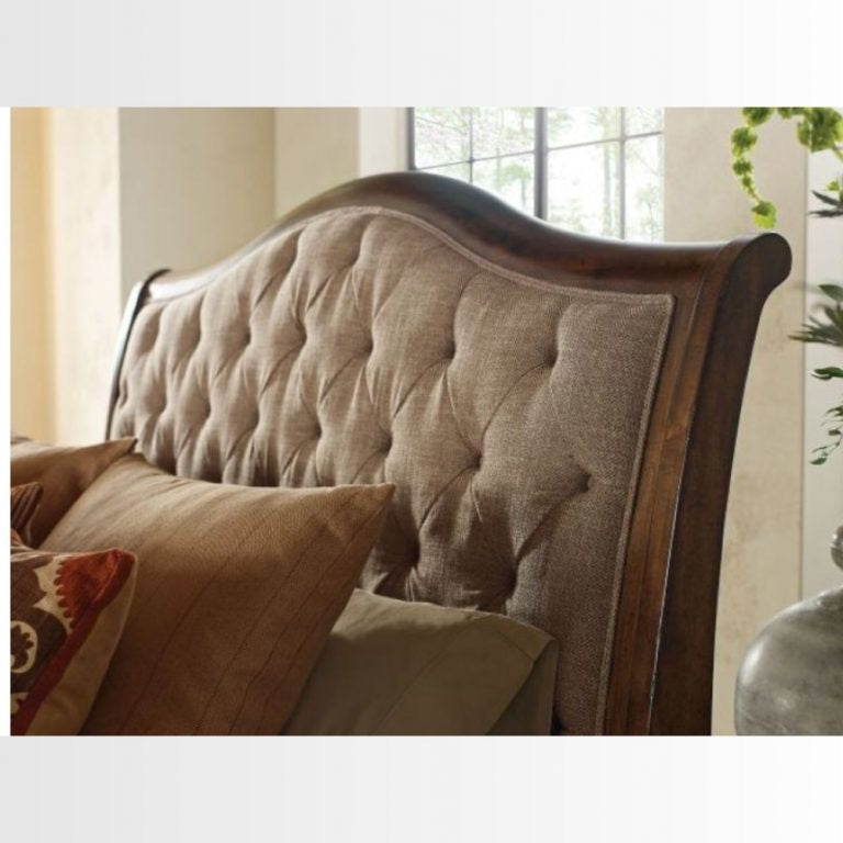 This walnut-colored King-sized bed has a contemporary look which gives it a perfect mid-century furniture feel. The bed has comfortable tufted cushions making it the ideal combination of modern + contemporary.
