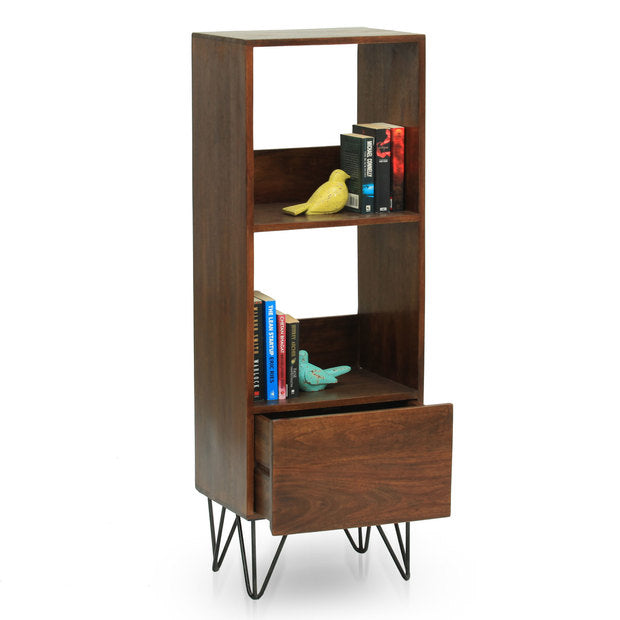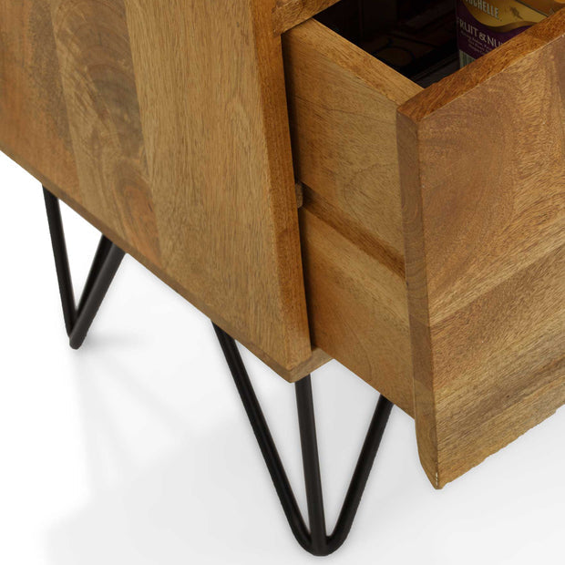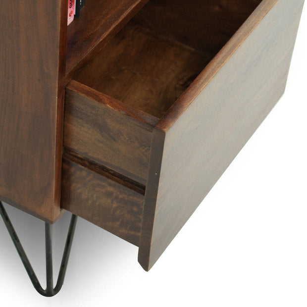 It combines a sleek mango wood body with a geometric take on iron hairpin legs, complete with a drawer for added functionality.