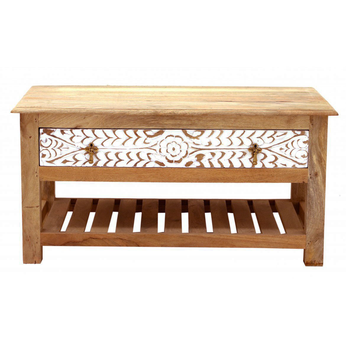 This mesmerizing collection called Dahlia carved is a real treat. Hand-carved, hand-crafted, hand-waxed giving meaning to it. The railed base at the bottom with a full-length drawer with carving at the front and adorned with antique brass-looking handles.