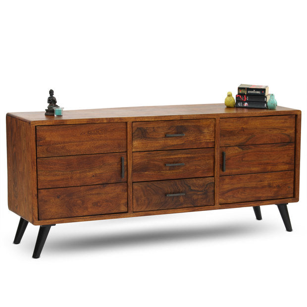 This Solid wood weather-resistant Sideboard is a true value for money as it is not just strong and sturdy for the entire television set but also for your personal decorative items and quick handy pick items like your keys etc. The storage gives you the option to store your books, CDs and DVDs and stuff.
