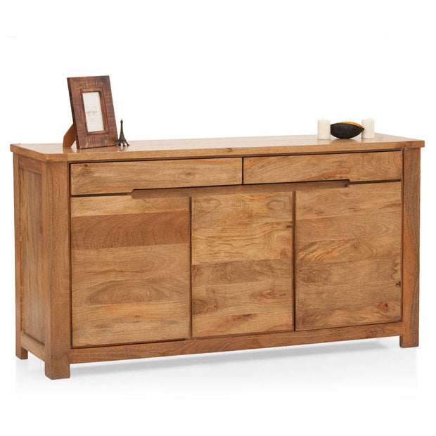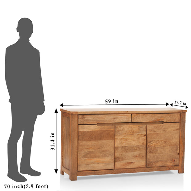 Exclusive functional fashioned in solid mango wood. The boxy silhouette highlights the contrasting surface textures, the two drawers, and two cabinets with adjustable shelve serve really well for the spacious storage.