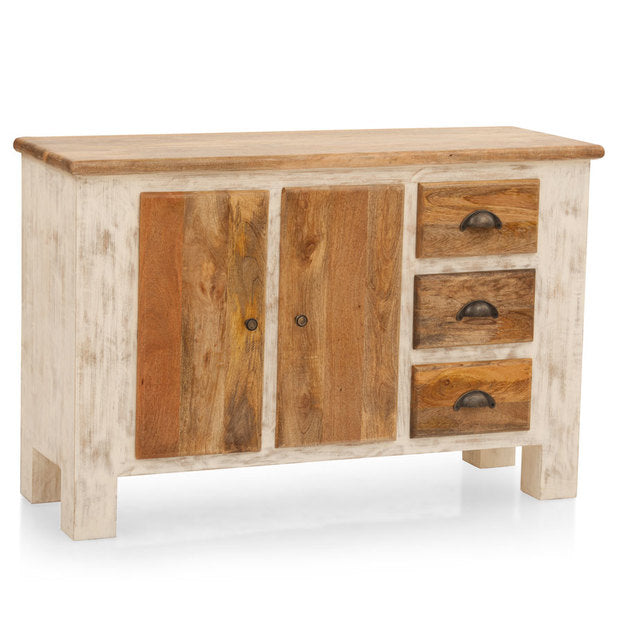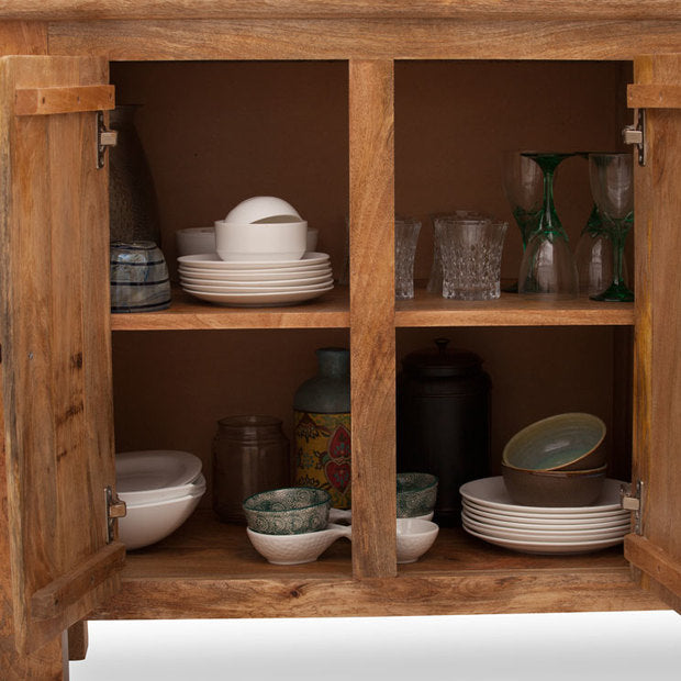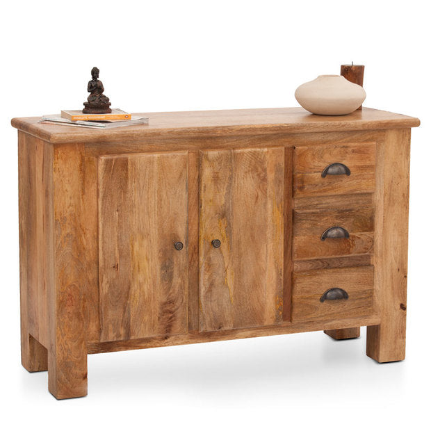A versatile sideboard comes complete with three arched metal handle drawers and two door cabinet. The wide tabletop helps display it as a console in the living room or store away all the crockery and cutlery for the dining room. Our delivery team installs the product.