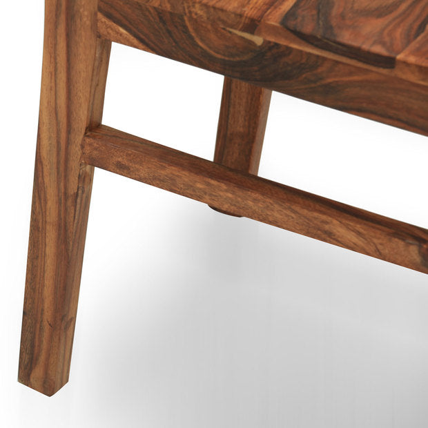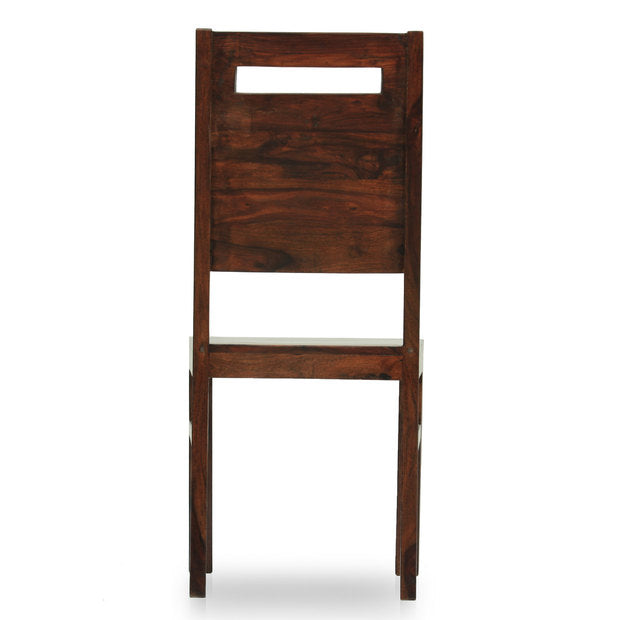 A sturdy, lightweight chair constructed from solid Sheesham wood in a light finish, Temecula-dining chair coordinates perfectly with any style of the dining table or desk. Its floaty form and a slot at the back help shift and move the chair around with ease. Overall, it's a must-have for your dining room.