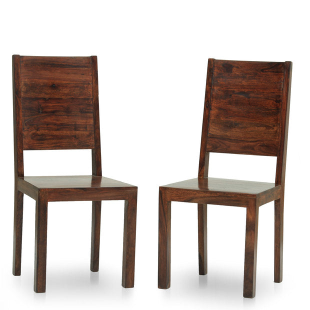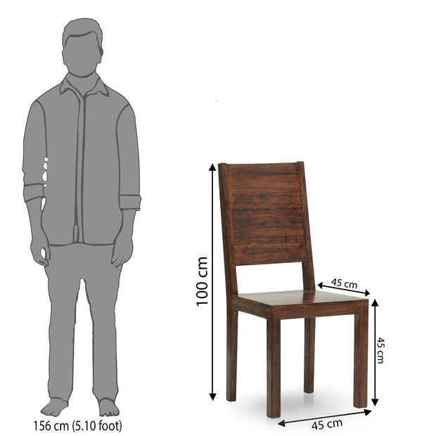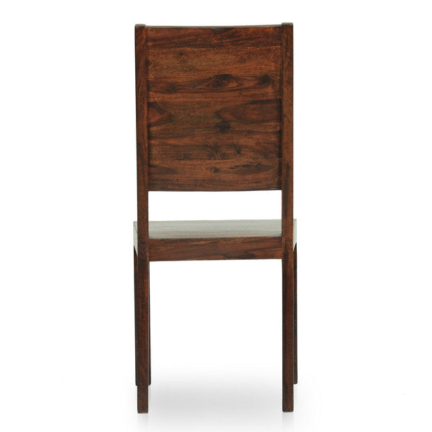 A simple and solid piece, this medium back chair owes its beauty to the abounding wooden grain. Plain seat and structured legs are modeled from high-quality Sheesham wood. Light finish completes the desired look.