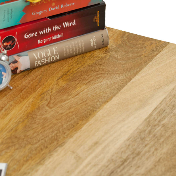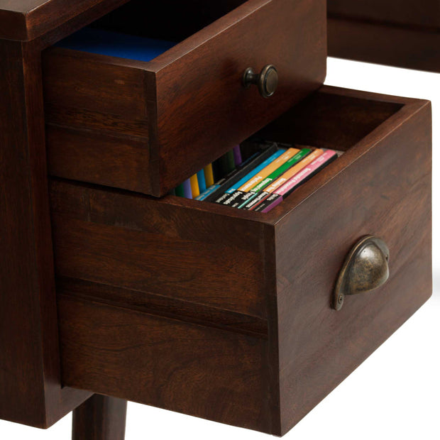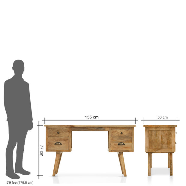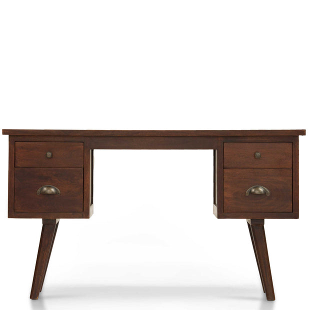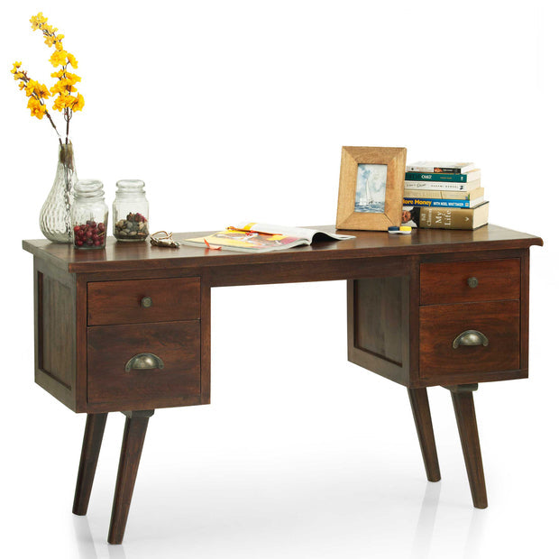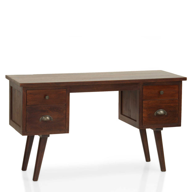 The Prague Desk is perfect for a contemporary setting. Crafted from solid mango wood, this is a balanced design with four drawers, two on each side, that offer versatile storage options. The slender, angled legs impart the piece an unusual character. It blends perfectly in your hallway, kitchen, or living room.