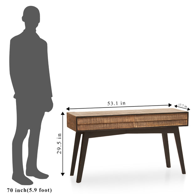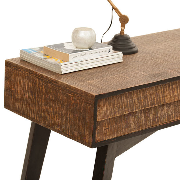 A Perfect Stasher for your home office. This wide desk is crafted with mango wood, the tabletop and the drawers has an enduring burnt finish with striking lines which adds a touch of sophistication to your living or study room. Even the drawers are a design feature which has enough room for keeping all your essentials handy.