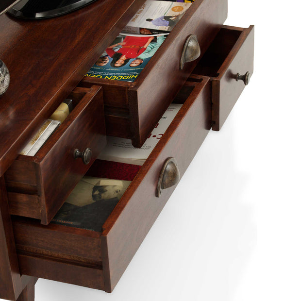 The drawer play below the top makes for a visual treat with their unique brass or zinc-effect handles. The multi-functional side shelves can be stacked up with DVDs and other media equipment.