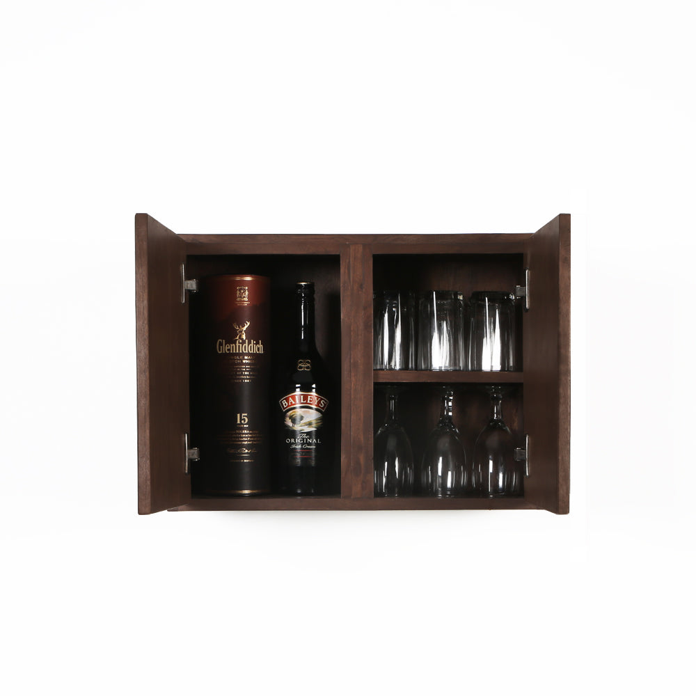 The SOLITUDE Wall Bar is perfect for anyone who needs to stock up a couple of bottles and glasses and doesn’t have space for a full-size cabinet. You can store 3-4 bottles on one side and up to 12 glasses on the other side. Also, if you want to store only bottles on both sides, you can do that quite efficiently thanks to the removable shelf provided inside.