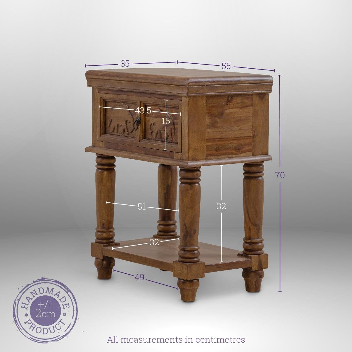 The Haathi bedside table from the royal Haathi collection is a quirky and fun addition to any bedroom. Made from Sheesham wood, this table features a single drawer and shelf for storage and is adorned with a hand-carved elephant mural. Bring a touch of whimsy to your room with Haathi!